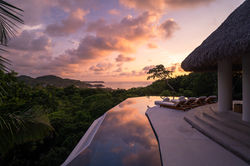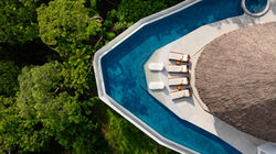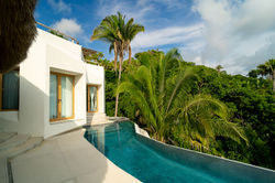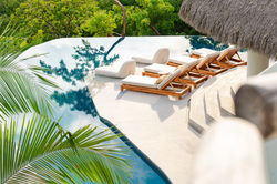 The palapa’s great room offers a panoramic view of the perimeter pool, the jungle, the sea, and the sky. The master bedroom is visually connected to the pool, and the master bathroom links directly to it via a staircase that descends to the cold plunge; the hot tub is positioned on the opposite side of the pool.